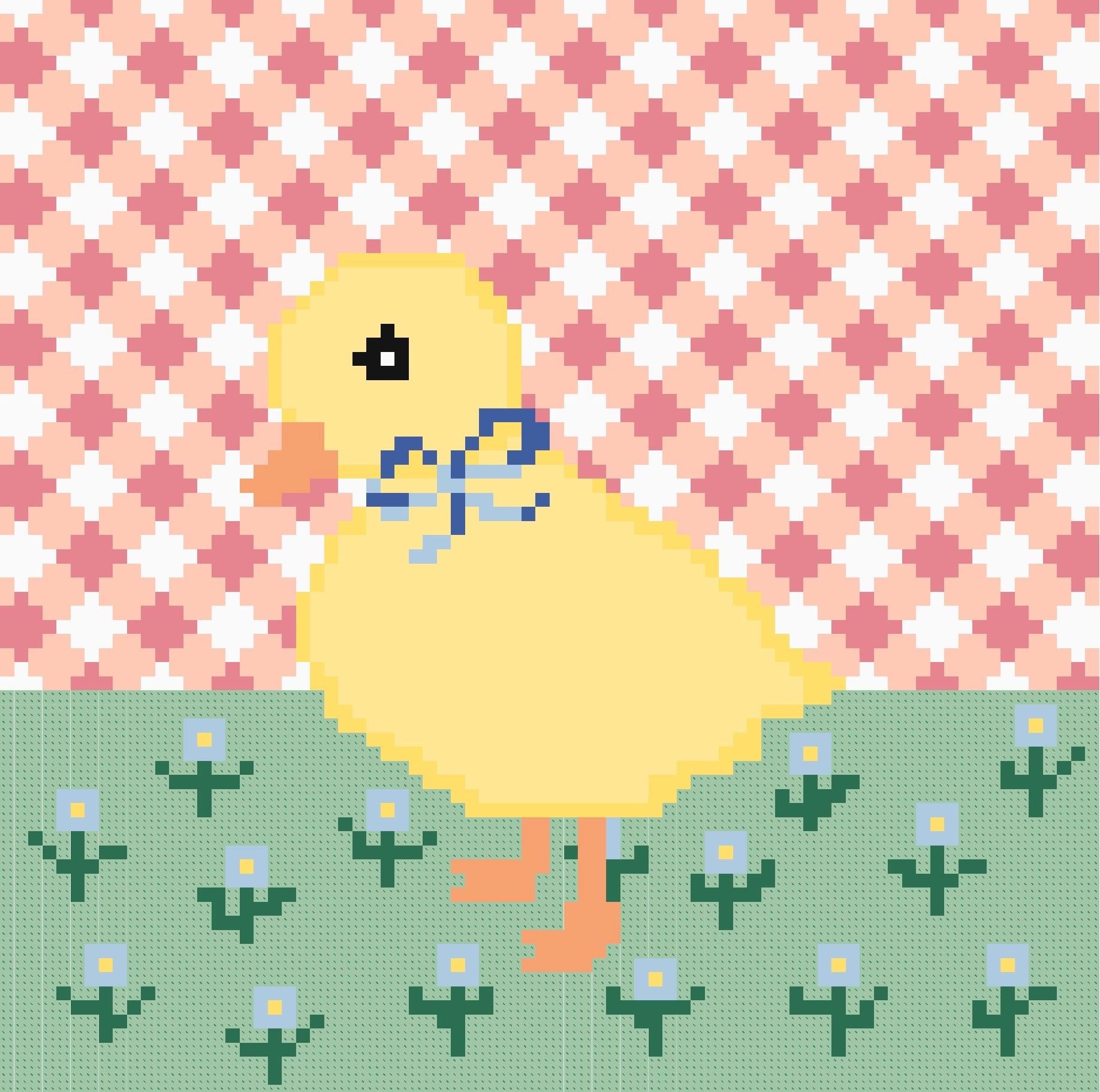 Meet the sweetest little duck you'll ever stitch! This charming needlepoint chart features an adorable yellow duckling with a blue bow, waddling through a cheerful garden of blue flowers against a classic peach and pink and white geometric background.